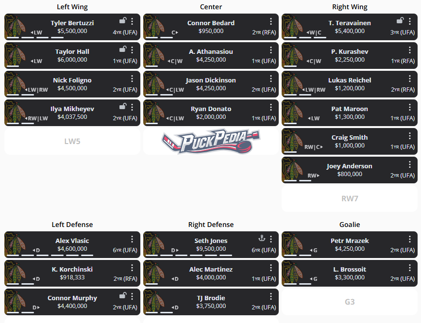 Teuvo will play well with Bedard considering he’s a pass-first winger and is very good on the forecheck. Oh, and Teuvo is also a solid two-way player. Much needed. By the way, Teuvo is going to be 30. Remember his first season with the Hawks? Yeah, he was 20. Time flies.