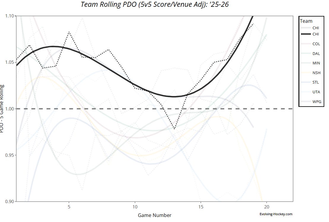 The Hawks have been riding a league-high PDO for some time (1.050). Eventually, things will crash down. And that’s fine. I mean, the Montreal Canadiens are going through a real rough stretch of their own, although that can be pinpointed to injuries (Alex Newhook and Kirby Dach among some), piss-poor goaltending, and some questionable coaching decisions.