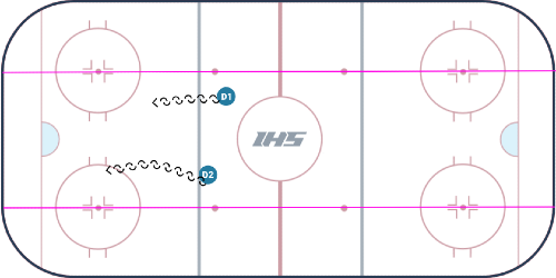 If the F3 pressures the puck carrier past the red line, D1 must hold the middle of the ice. If the F3 angles the puck carrier to the wall, D1 still holds the middle of the ice. The two players must communicate with each other.