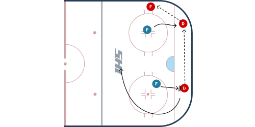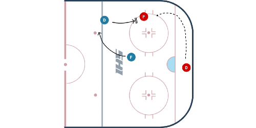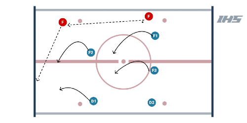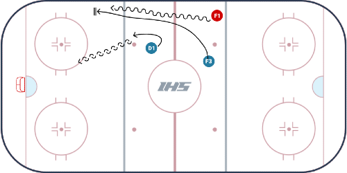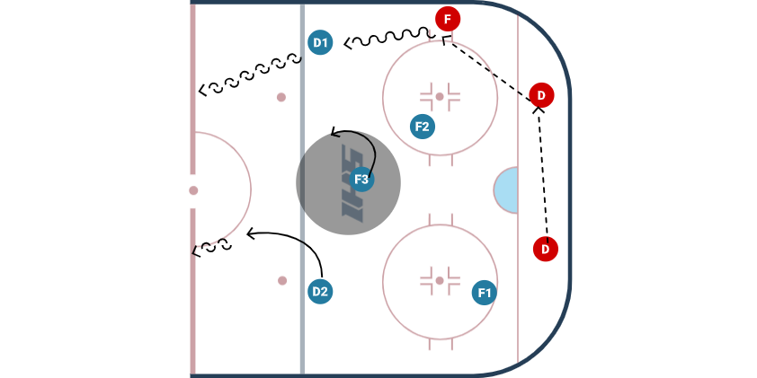 The F3 can also hold pressure on the puck carrier until the red line, at which point he releases the puck carrier to the defensemen. If F3 protects the middle and is in a good position to support, D1 can stand up the puck carrier at the blue line. If the defenseman is standing up to the attacker, F3 must be in a position to support. This goes the other way around too.