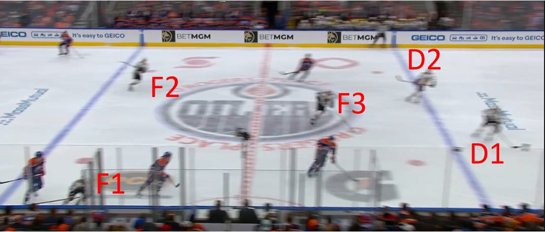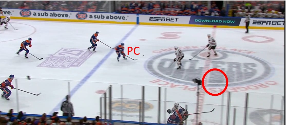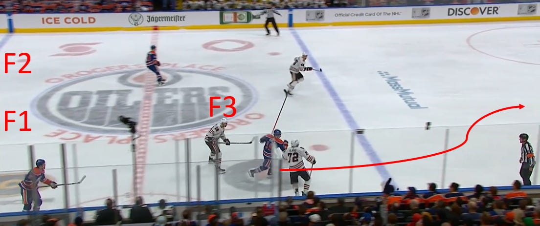In the above clip, watch Lukas Reichel, the F3. When the Oilers enter the neutral zone, Louis Crevier is already pinching the high forward. Reichel, as the F3, needs to pick up the open space. Instead, Reichel watches Ryan Nugent-Hopkins pass the puck to Connor McDavid and then follows the puck, leaving a hole wide open and Vlasic alone. As soon as the Oilers enter the offensive zone, they take advantage of the open space and score a goal.