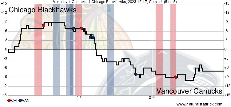 The Hawks had decent possession in the first with a 52.47 Corsi For percentage (CF%). They would finish the game with a 37.61 CF%, in all situations, which is to say, the Hawks did not have the puck a lot.
