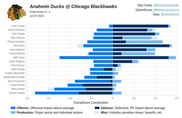 The Blackhawks ended up pulling the W in a manner about as exciting as watching paint dry. The lack of talent on this team is putting a dull product out there on the ice. With a plethora of dump-and-chase hockey, the Ducks outshot the Hawks 37-25.
