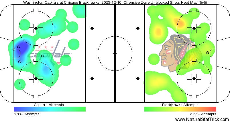 Going back to shot quality. The Hawks had 34 shots to the Caps 27. Hawks also had the upper hand in shot attempts with 62 to the Caps' 55. Even though the Hawks had the volume, the shot map below indicates their poor shot selection.