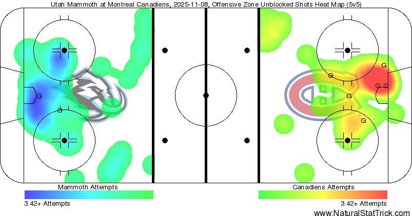 The Mammoth played a good game too (at least, until the third period). They had the advantage in puck possession metrics (53.26% Corsi). Utah also had a 21-19 shots on goal advantage. They played a strong defensive game until the third period, when it seemed like Montreal’s dominance frustrated them. The Mammoth had a 33.63% expected goals share in that period alone.