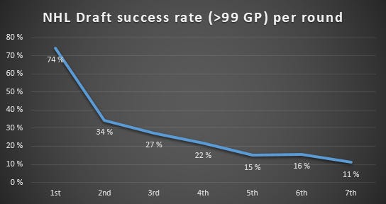 Besides potential trade chips, the boatload of 2nd round picks also increases the chances of hitting on an NHL player. Below is a chart that shows how likely someone is to play in the NHL based on where they are picked. Players picked in the 2nd round have a 34% chance to play over 99 games in the NHL. A considerable dropoff from 1st rounders, who have a 74% chance of becoming an NHL player.