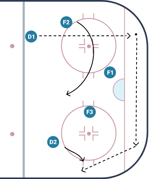 The above is from Jack Han's 2024 Hockey Tactics book. This is how the Jets forecheck. D2 pinches into the half wall while F2 covers space up high. The problem is that teams figured out how to counter this and generate odd-man rushes. Their aggressive pinching gets them into trouble as of late.