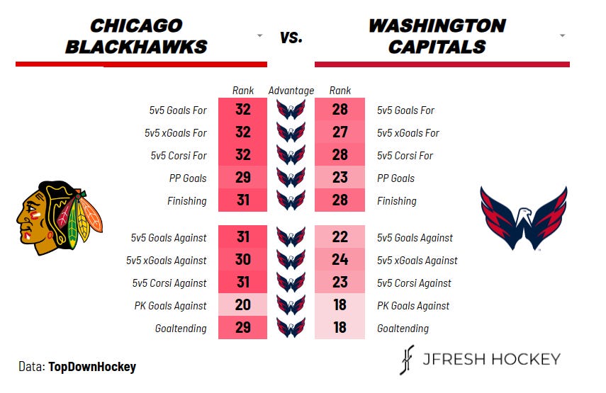 The Caps struggles this season haven't been a surprise other than the reality of Ovi's age stifling his goal-scoring. They struggle to generate offense as a whole and without Ovi to carry them the Caps generate 54.14 shot attempts per 60 min at 5v5. That's at the bottom of the league and just above the Hawks 51.84. You would think this is a good chance to let our defense not get caught up in puck watching.