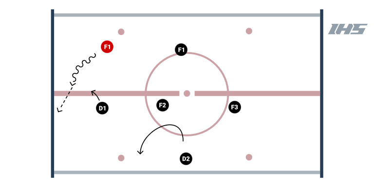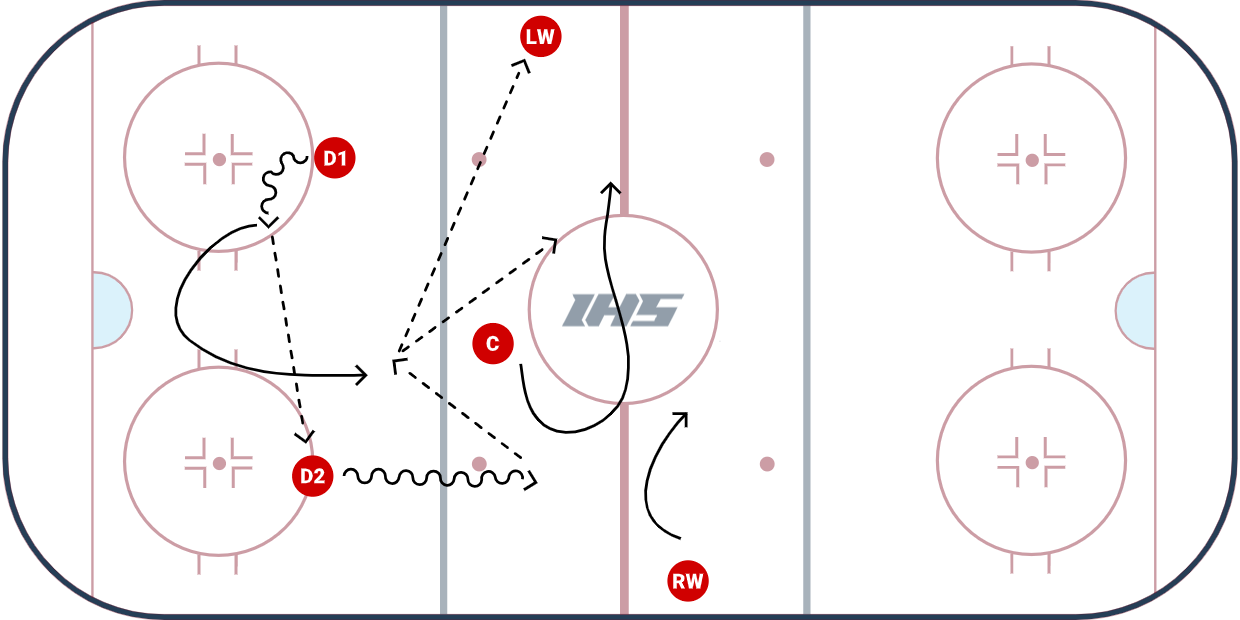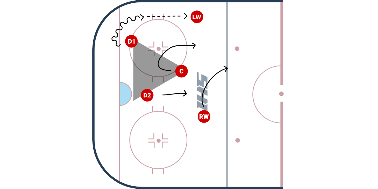 For their breakout, they need to lock on the basics. One player retrieves the puck. One player goes to the net or the backside corner. The other player goes in the slot. They should be forming a triangle. This leaves the wingers up high and ready for a breakout.