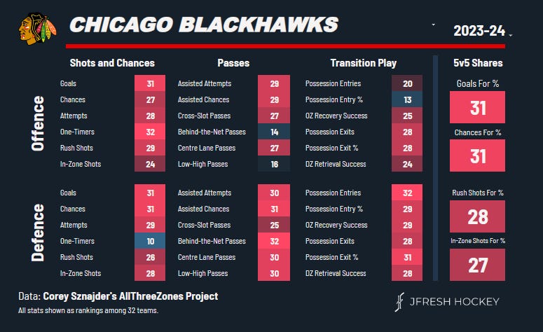 Looking at data from JFresh Hockey and AllThreeZones, the Hawks are 28th at possession exits and 28 at DZ Retrieval Success, indicating their struggles on the breakout. The Hawks are already limited to a simple quick-up for breakouts and chip behind pressure in the NZ. But this gives up the controlled entry and looking at the Hawks numbers, they're already awful at retrievals in the OZ.