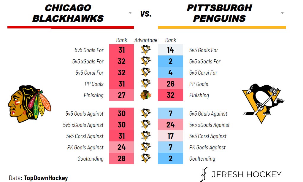In their last 10, the Penguins are 3-5-2. They've also had a 49.23 expected goals share percentage (xGF) and an actual goals share (GF) percentage of 45.16%. Not good but much better than how the Hawks are looking (you'll see...).
