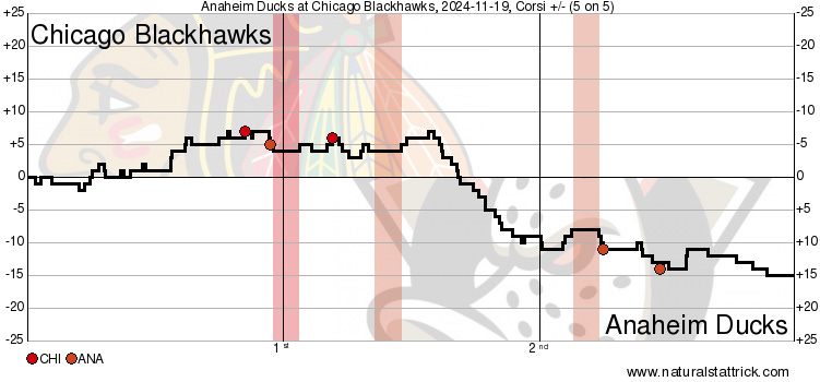 The first period didn't look bad for the Hawks. They had a 56.67 Corsi at 5v5 and a 72.81 xG% as well as owning 10 shots on goal to the Ducks 7 at all strengths. I almost thought that it was sustainable but the Hawks let the Ducks outplay them after they had a 2-1 lead. And it's not even that the Ducks outplayed the Hawks, the Ducks just caused chaos in the Hawks' zone because they couldn't breakout.