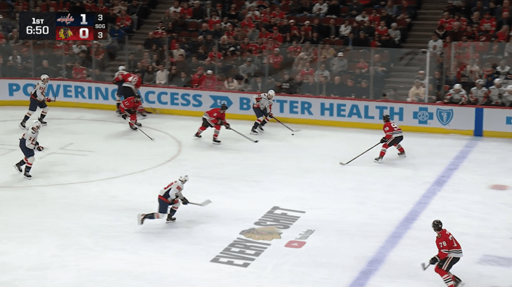 The second goal: Crevier pinches in the OZ to collect a rebound and Connor Bedard provides support as the high forward. The Caps win possession, Ryan Donato goes for a line change, and Bedard provides distant support to TJ Brodie.