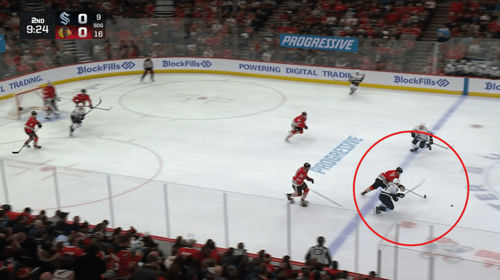 I loved this play by Frank Nazar. He pins the puck carrier to the wall allowing the Hawks to break out. Nazar finished with 1 shot attempt, a 50 Corsi, and a 62.96 xG%.