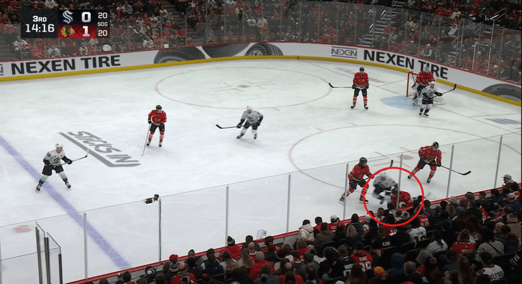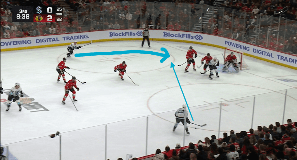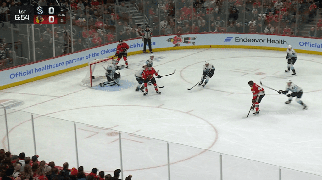 Things looked familiar with that first goal from the Kraken. Under one minute is spent puck-watching as the Kraken manipulates the Hawks' DZ. A screenshot below shows how the Kraken uses space to find the seem and score off the pass.