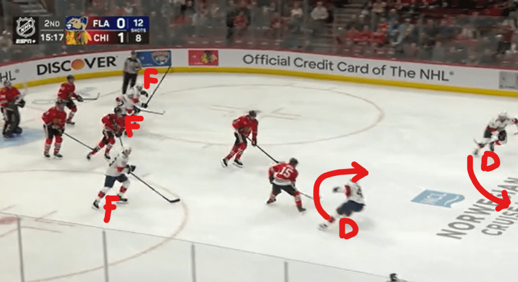 The Hawks' inability to get out of the zone was both a lack of skill and the Panthers' very aggressive forecheck. The Panthers use a 1-2-2 and activate a D-man to create more pressure. With the D keeping such a tight gap, it made for tough breakouts for the Hawks.