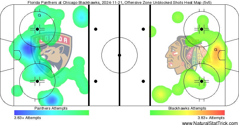 The Hawks played their same ol' game. They get a lead and hold on for dear life by shelling up in their zone. It's Luke Richardson's game of defense. It's a good thing the Hawks looked ok on defensive positioning because they couldn't get the puck out of their zone for anything. A lack of offense and a scoreless Connor Bedard has me not totally satisfied. In the third period alone the Hawks owned 35% of 5v5 shot attempts and finished with a 39.16 xG%.