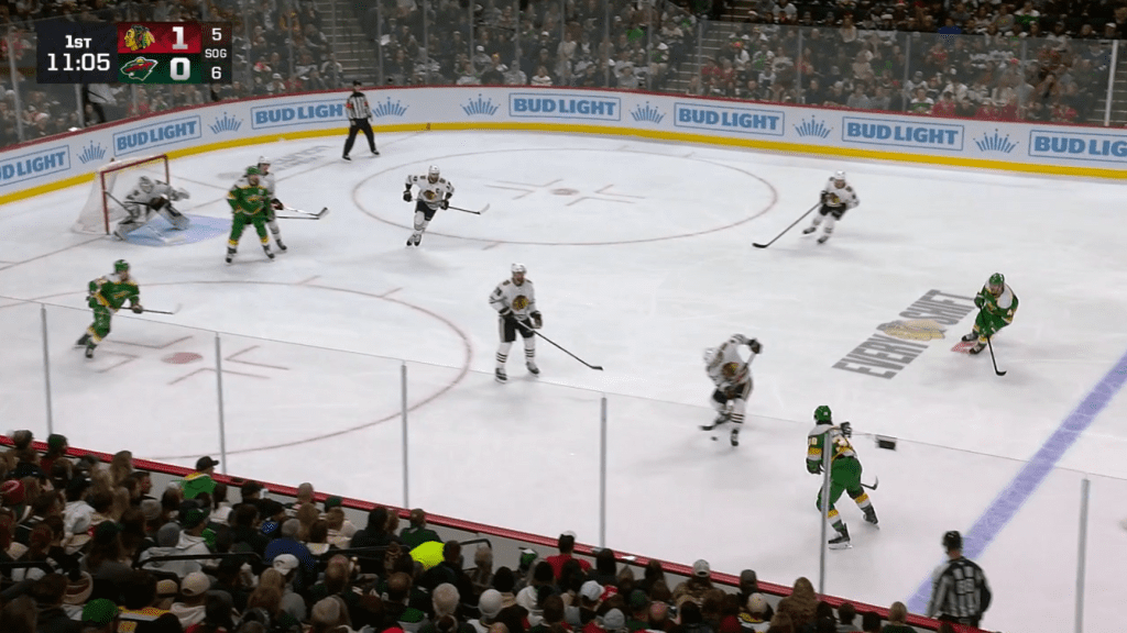 Kevin Korchinski could have battled more as the weak side D. His partner, TJ Brodie, initially plays Jones and releases him to Korchinski, allowing Brodie to challenge the shooter.Faber (4), Brodin (8), Khusnutdinov (3): The Hawks do some puck watching and the Wild take advantage with Brodin passing to MIN7 Brock Faber who one-times it from the high slot. This is another bad defensive breakdown from the Hawks.