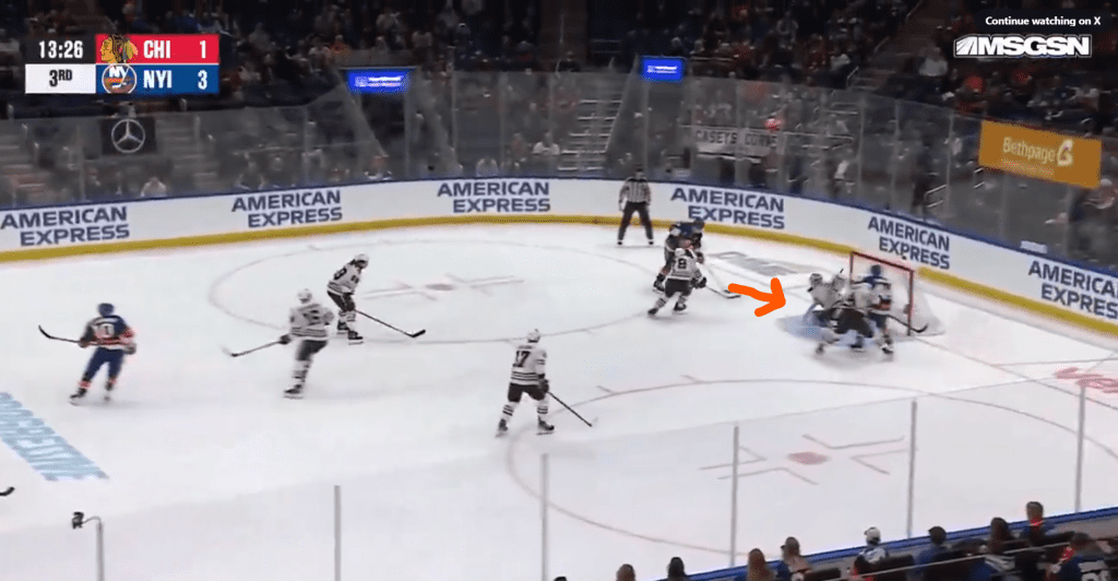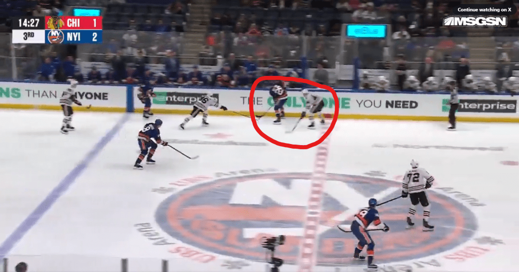 Bo Horvat took advantage of Brodie not really doing anything to him. A wave here, a wiggle of the stick there. Brodie lets Horvat get nice and close to score the Islanders' 4th goal.