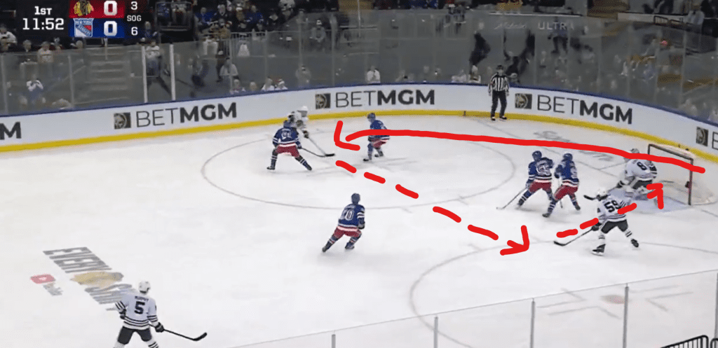 The first goal is a good example of the Hawks taking advantage of the poor defensive positioning of the Rangers. Actually... it doesn't look too different from Brandon Tanev's goal on Sunday. Taylor Hall carries the puck from behind the net and passes through 2 seems to find Tyler Bertuzzi. Good stuff.