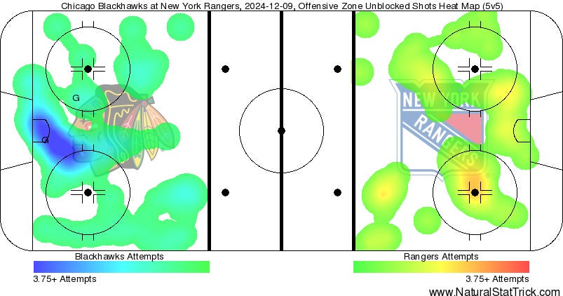 Those breakdowns would give the Blackhawks 11 5v5 high-danger chances. The Rangers only had 5. The heat map below gives you a good visual.