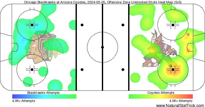 Blackhawks Coyotes Goals 5 2 Corsi 68 64 Shots on Goal 32 39 xGF% 58.32 41.68 Scoring Chances 30 27 High Danger Chances 14 9