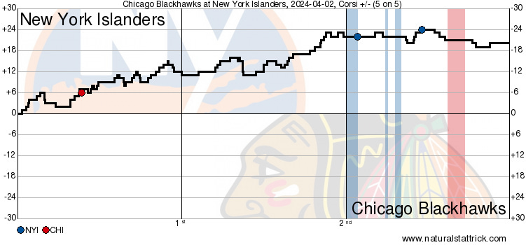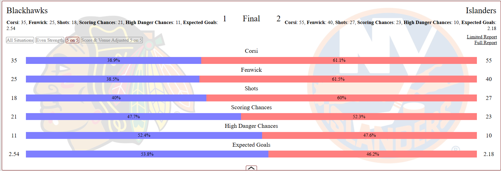 What's interesting is that while it looked like the Hawks were limited to chances on the perimeter, the heat map paints a totally different picture. The Hawks also had 7 high-danger chances in the 1st period and 4 in the 2nd, which might skew the map. The Islanders protected the slot for the most part and left Sorokin to deal with the low-percentage perimeter shots. Easy saves.