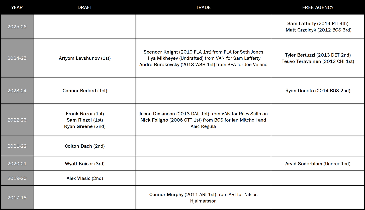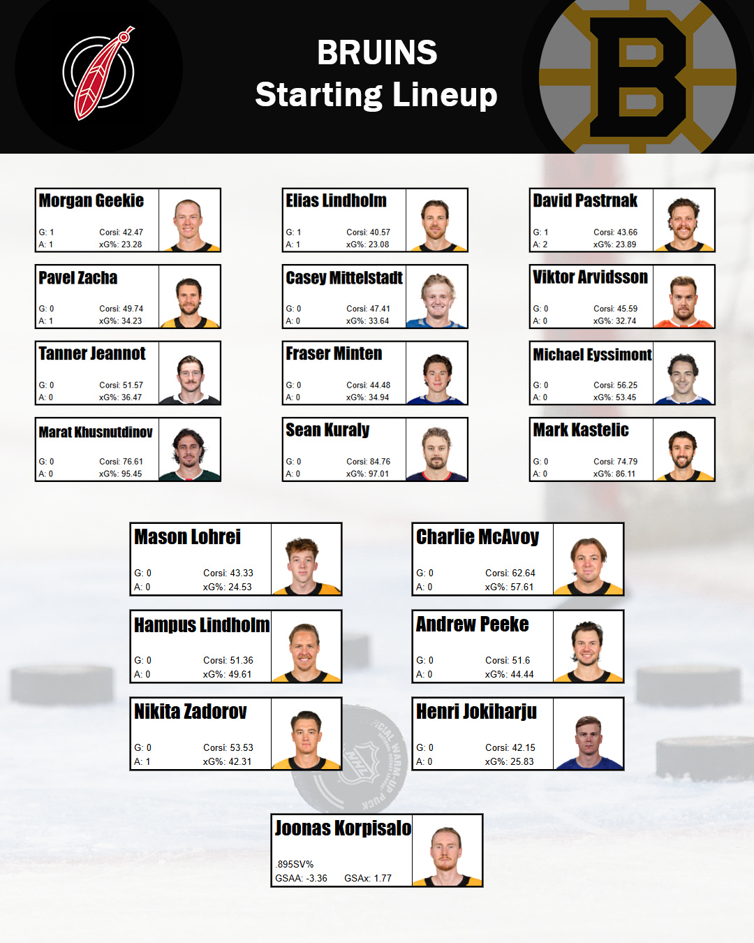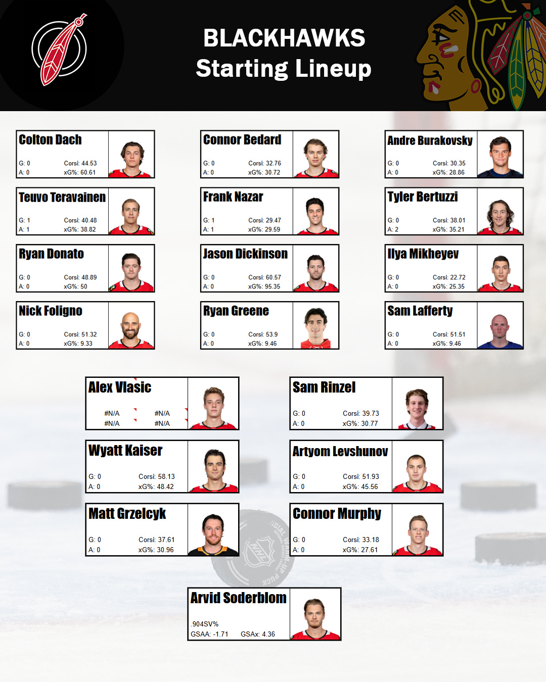 Arvid Soderblom is in net, and yes, in the lineup card above, that’s Spencer Knights’ SV% from last year (the other goalie stats are his).