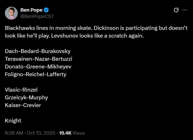 Artyom Levshunov is missing his second game as a healthy scratch. Through two games, Levshunov has eight penalty minutes. While there’s a lot to be excited about with Levshunov’s offensive instinct (like his assist against the Bruins), there’s a lot of doubt that’s weighing on my heart. If Levshunov does need time in Rockford, I’ll be looking back at the 2024 draft with questions.