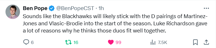 Other than enjoying some hockey, there isn’t too much to invest in. This will be our first look at a Bertuzzi-Bedard-Teuvo line. It’s preseason so don’t expect this to be anything what it would be in the regular season. It’s mostly exciting because Teuvo will be wearing a Hawks sweater once again.