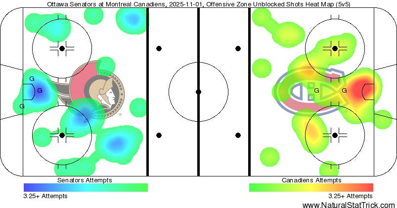 But Montembault isn’t blameless. The Canadiens did a good job in the first period of limiting the Senators to taking low-percentage perimeter shots. But sound defense gave way to sloppy structure, which tested Montreal’s struggling goaltender. Head coach Martin St. Louis gave his starter the chance to prove himself in Saturday’s game, but he performed with an .824 SV%. He stopped three of five high-danger chances at 5-on-5.