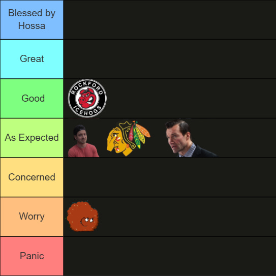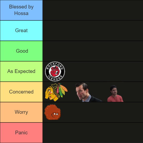 If you want an explanation of the little pictures, here you go. After those first 10 games, I didn't move Luke Richardson because I wasn't sure if my small concerns would grow into real ones. Kyle Davidson stayed put because we didn't know if his personnel moves worked. The Blackhawks looked better than last season and I also factored in the fact that a lot of the new players needed time to gel. As for my perceived reaction of the fanbase (represented by Meatwad), they seemed to be leaning towards Panic. As for Rockford, things were looking good because it was the start of a new season with new players.