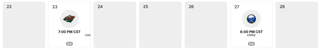 Short hockey week. The Hawks play the Wild tonight at 7PM central before taking a holiday break. After that, they play on Friday, the 27th, in Buffalo at 6PM CT.