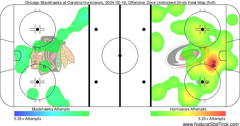 Blackhawks Hurricanes Goals 3 6 Corsi 37 80 Shots on Goal 22 42 xGF% 26.2 73.8 Scoring Chances 17 39 High Danger Chances 7 16