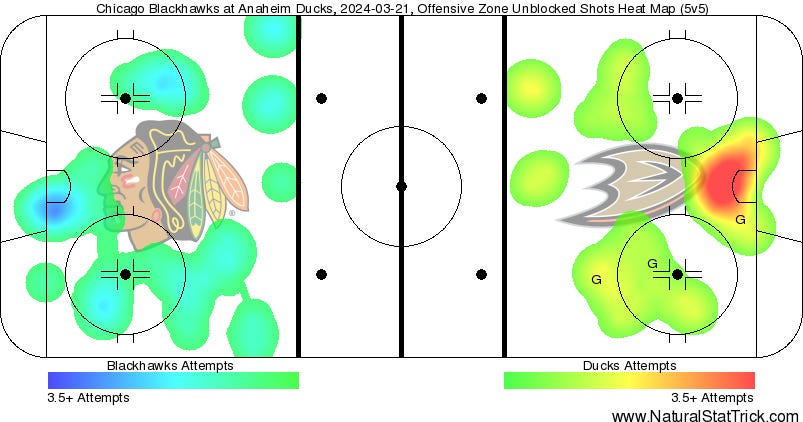 He played 17:56 and posted the following numbers at 5v5: 62.50 Corsi, on the ice for 0 goals, and the Hawks had an expected goals share of 41.36 when he was on the ice. Not horrible.