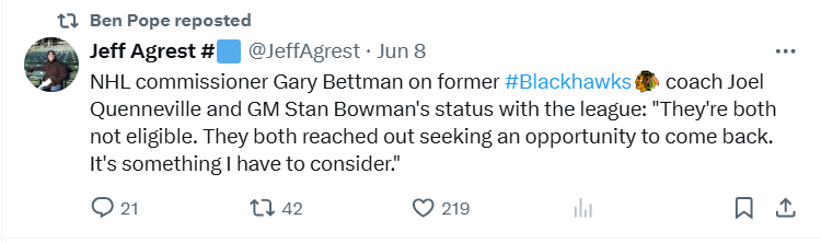 Bettman made it clear that Stan Bowman and Joel Quinnville are still not eligible to return to the NHL. Bowman and Q had reached out to see about being a part of the NHL again.
