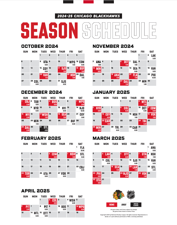 Here is the schedule and I’m adding the Blackhawks regular season schedule which can be grabbed from their website.