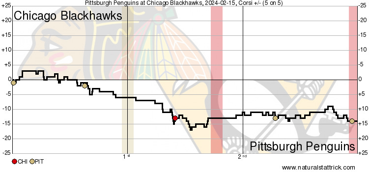 Blackhawks Penguins Goals 1 4 Corsi 35 49 Shots on Goal 22 26 xGF% 35.25 64.77 Scoring Chances 15 28 High Danger Chances 5 16