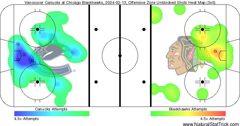 Blackhawks Canucks Goals 2 4 Corsi 30 51 Shots on Goal 15 29 xGF% 31.6 68.4 Scoring Chances 16 33 High Danger Chances 8 17