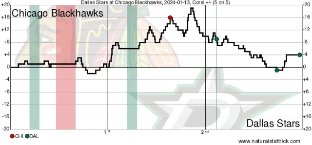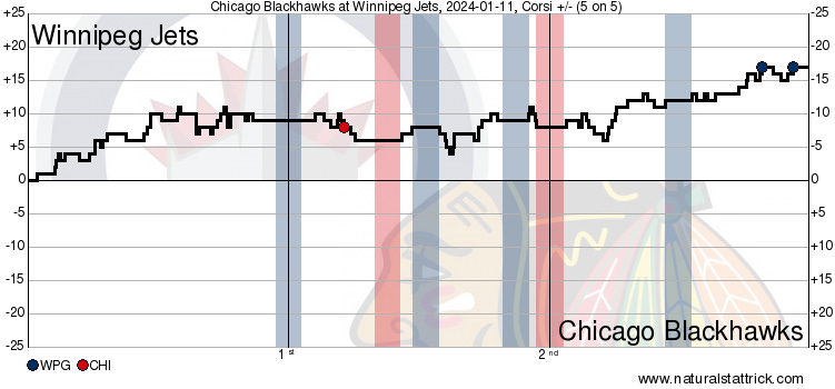 5v5, the Hawks had 41.58% of shot attempts (aka Corsi For), and finished with 21 shots on goal for and 28 against (all strengths). Their best effort was surprisingly the second period, which is when they normally shut down. They suppressed the Jets to only 6 shots on goal while putting 10 shots on net.