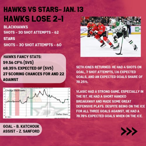 The Hawks lost to an Oilers team who was hot off of a 7 game-winning streak. The good out of this game was the way the Hawks played. They outshot the Oilers and looked better than them in regards to fancy stats and the ol’ reliable eye test.