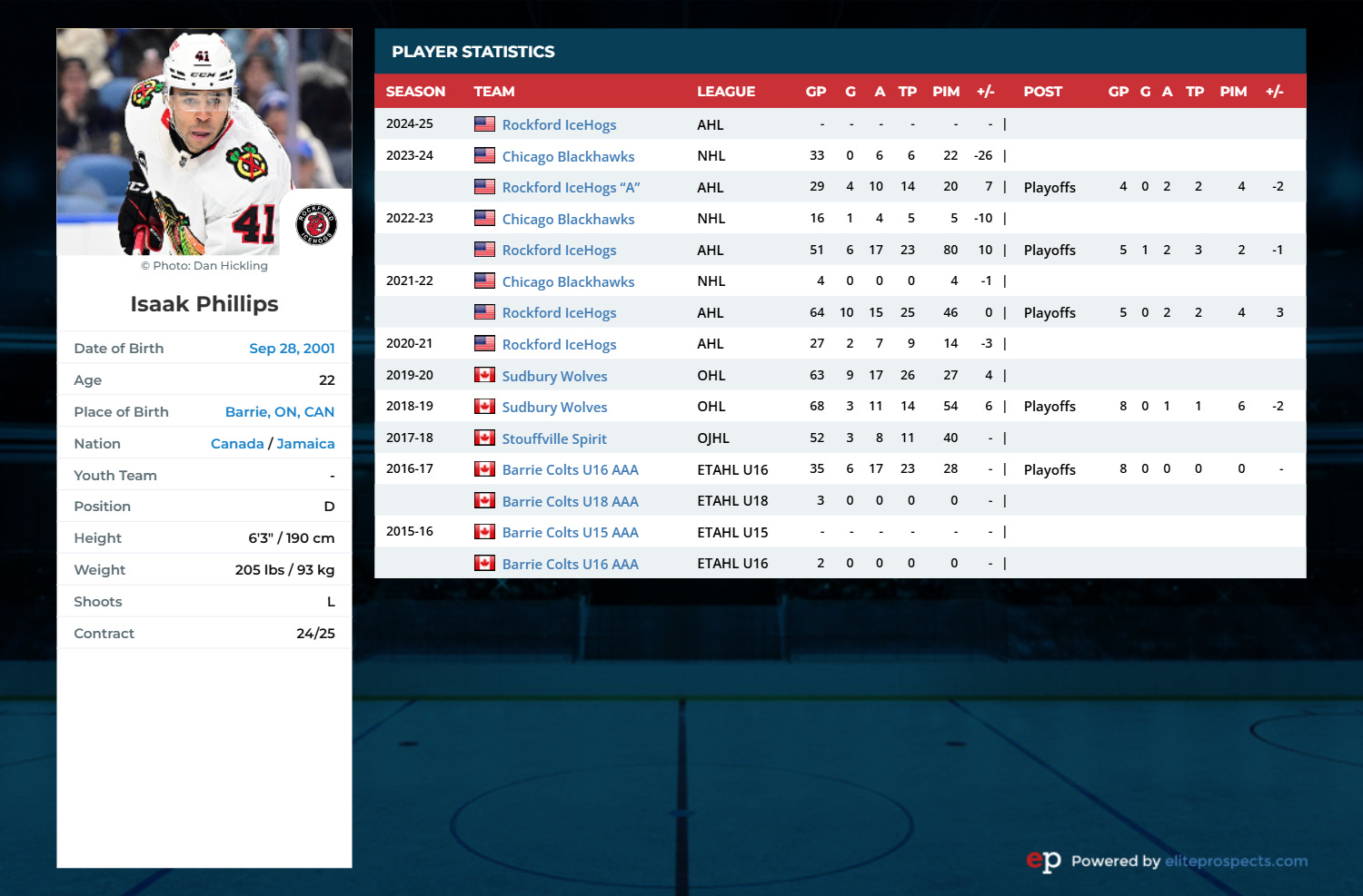 He can move. His first (and only) NHL goal perfectly captures his acceleration, speed, and passing. From the 2022 season, watch as Phillips (CHI41) leads the rush from the DZ and scores: