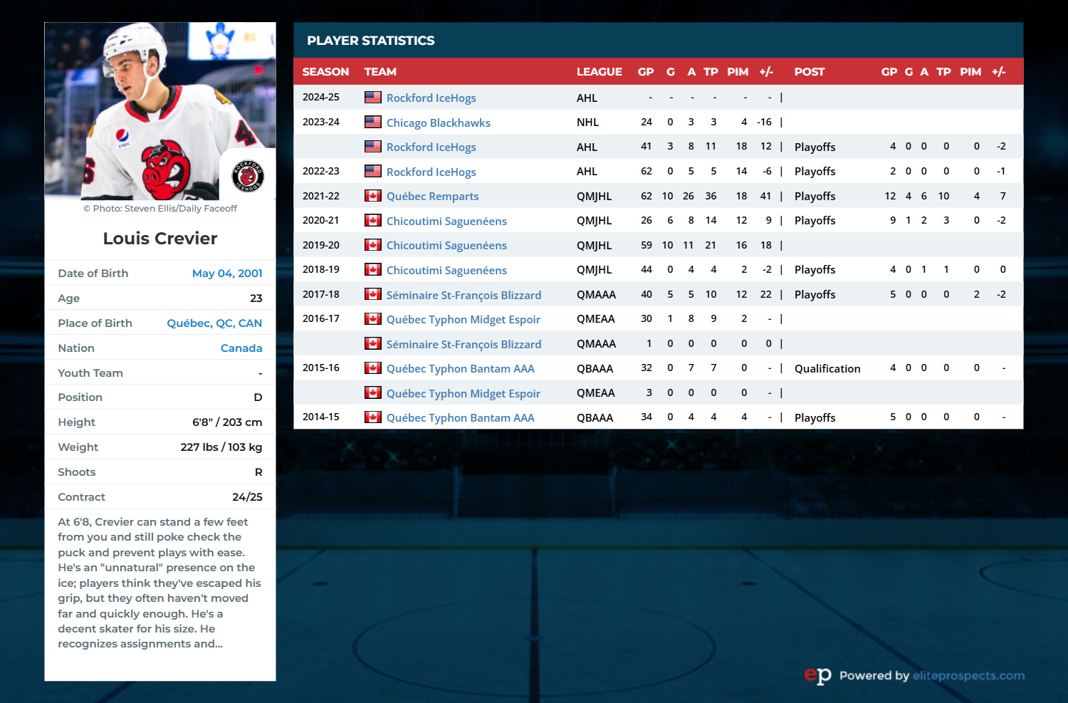 For our French-Canadian friend, Crevier showing up in the NHL as a 7th-round-pick isn’t a result of him being some late draft hit, the Hawks were ravished by injuries which forced Crevier making an earlier than desired NHL debut. Granted, he looked good at times. I would be very surprised to see him in an NHL lineup in the future.