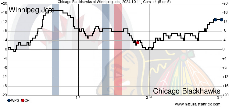 The Hawks didn’t get their sleep start. They looked good right from the start. The Jets owned even strength possession in the 1st with a 60.87 Corsi, but sound defensive positioning and good goal-tending helped the Hawks. The second period actually saw the Hawks with solid possession numbers, a 62.96 Corsi at even strength.