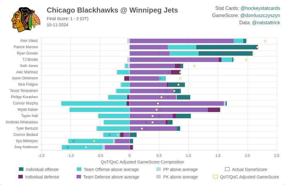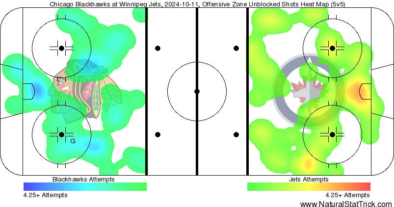 Shots on goal were much more level than shot attempts. In the first period, the Hawks had 6 to the Jets 7 shots. The Hawks also had better shot quality with an expected goals for of .94.
