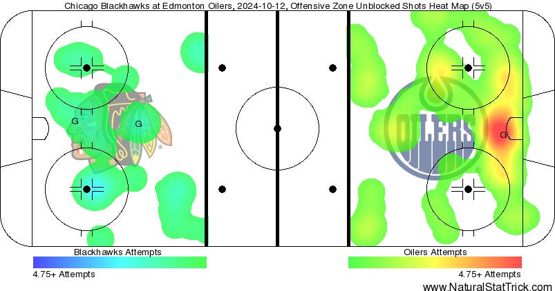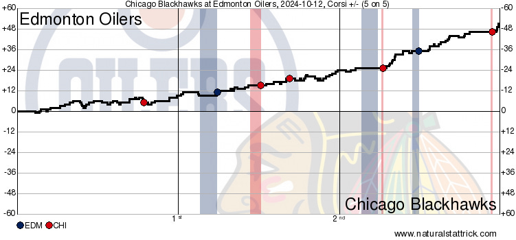 Looking at the numbers by themselves, you see that the Oilers looked a lot better than the Hawks in terms of possession numbers. Also, the Hawks’ 3 goals coming in the powerplay are also going to skew the numbers a bit. Sprinkle in a great showing by Mrazek and you have what looks to be a lopsided game when in reality it wasn’t.