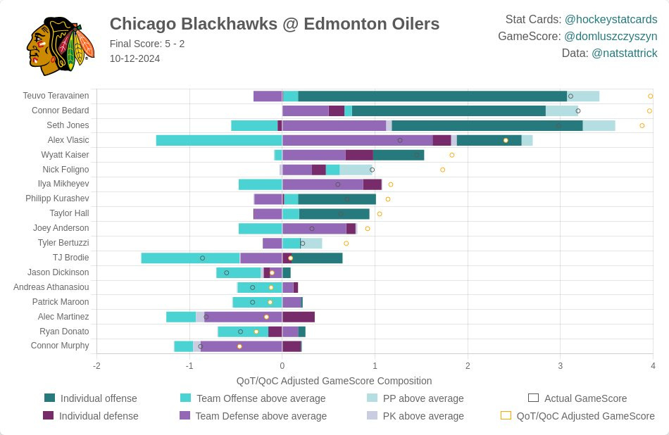 Connor Bedard had an excellent game. His fancy stats don’t make it look like that as the Oilers played better at 5v5 than the Hawks.